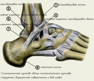 Не стоит забывать о наличии связочного аппарата, часто сопровождающего межкостные соединения. Голеностопный сустав укрепляют медиальная и латеральная вспомогательные связки. Первая напоминает букву дельта из греческого алфавита: сверху прикрепляется к внутренней лодыжке, снизу – к ладьевидной, таранной и пяточной кости. Вторая – идет от наружной лодыжки, расходясь в трех направлениях, образуя связки.