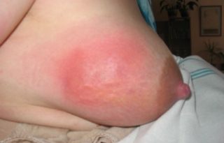 При инфицировании ранок появляется мастит. В этом случае покраснение, воспаление и гнойные очаги затрагивают всю молочную железу. Окружность соска и ареолы при пальпации содержат уплотнения.