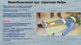 Во избежание появления пролежней места, где наиболее выступают кости, а также суставы нижней конечности обкладывают ватой или мягкими тканями. По бокам поврежденной ноги прикладывают 2 рейки или другие длинные приспособления. Внешняя должна прилегать к телу от подмышки до пятки, внутренняя – от паха. Аккуратно без резких движений перебинтовывают с ногой. В случаях, когда невозможно найти подходящих для сооружения шины предметов, допускается обездвижить конечности в положении «нога к ноге».