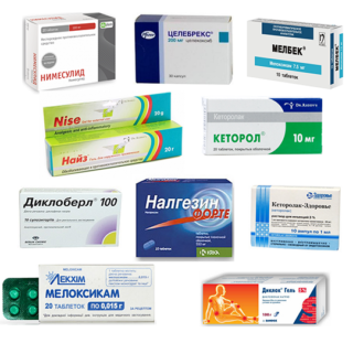 Кетопрофен (Кетонал, Кетоквин, Флексопрофен, Айнил), декскетопрофен (Дексалгин), кеторолак (Кетанов, Кеторол), диклофенак (Диклоберл, Диклофенак), теноксикам (Тексамен, Тексаред), мелоксикам (Мовалис, Ревмоксикам), лорноксикам (Ксефокам), индометацин,