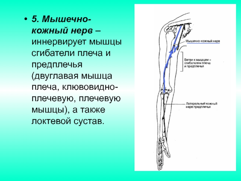 Мышечно-кожный нерв (лат. N. Musculocutaneus) выходит из латерального пучка, проходит через клювовидно-плечевую, двуглавую и плечевую мышцы, после локтевого сустава отдаёт латеральный кожный предплечья, Срединный нерв (лат.