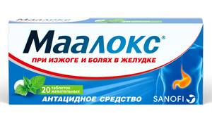- Маалокс. Антацидный препарат, способный устранить боль и дискомфорт в желудке, помогает бороться с кислой отрыжкой и изжогой. Производится в виде таблеток, содержащие сахар или без него, с мятным или лимонным вкусом. Их можно рассасывать или разжёвывать. Принимается препарат через 1-2 часа после еды или сразу при чувстве изжоги. Курс лечения – не более 2-3 месяцев. Разрешён с 15 лет. Содержит соли алюминия и магния.